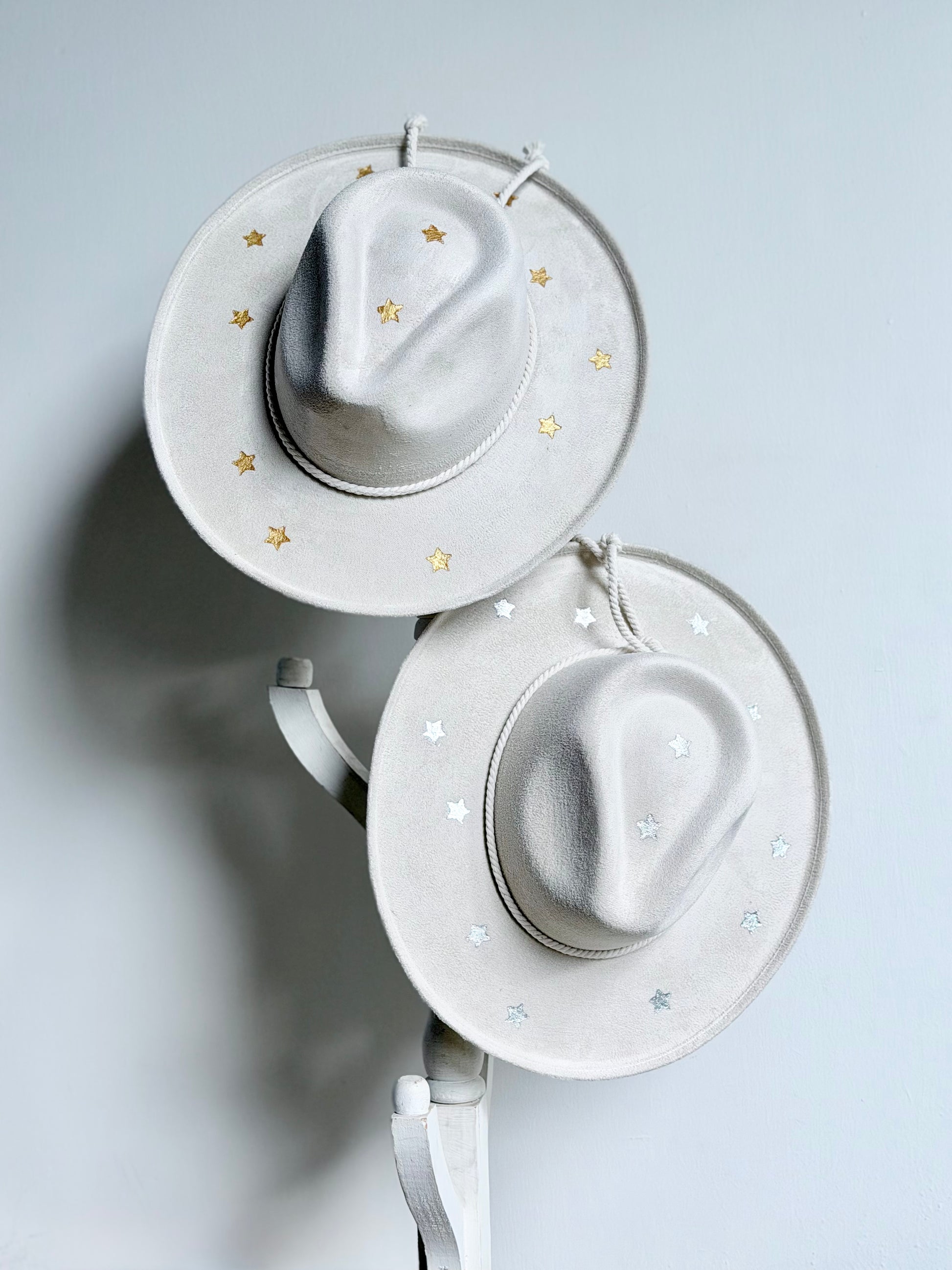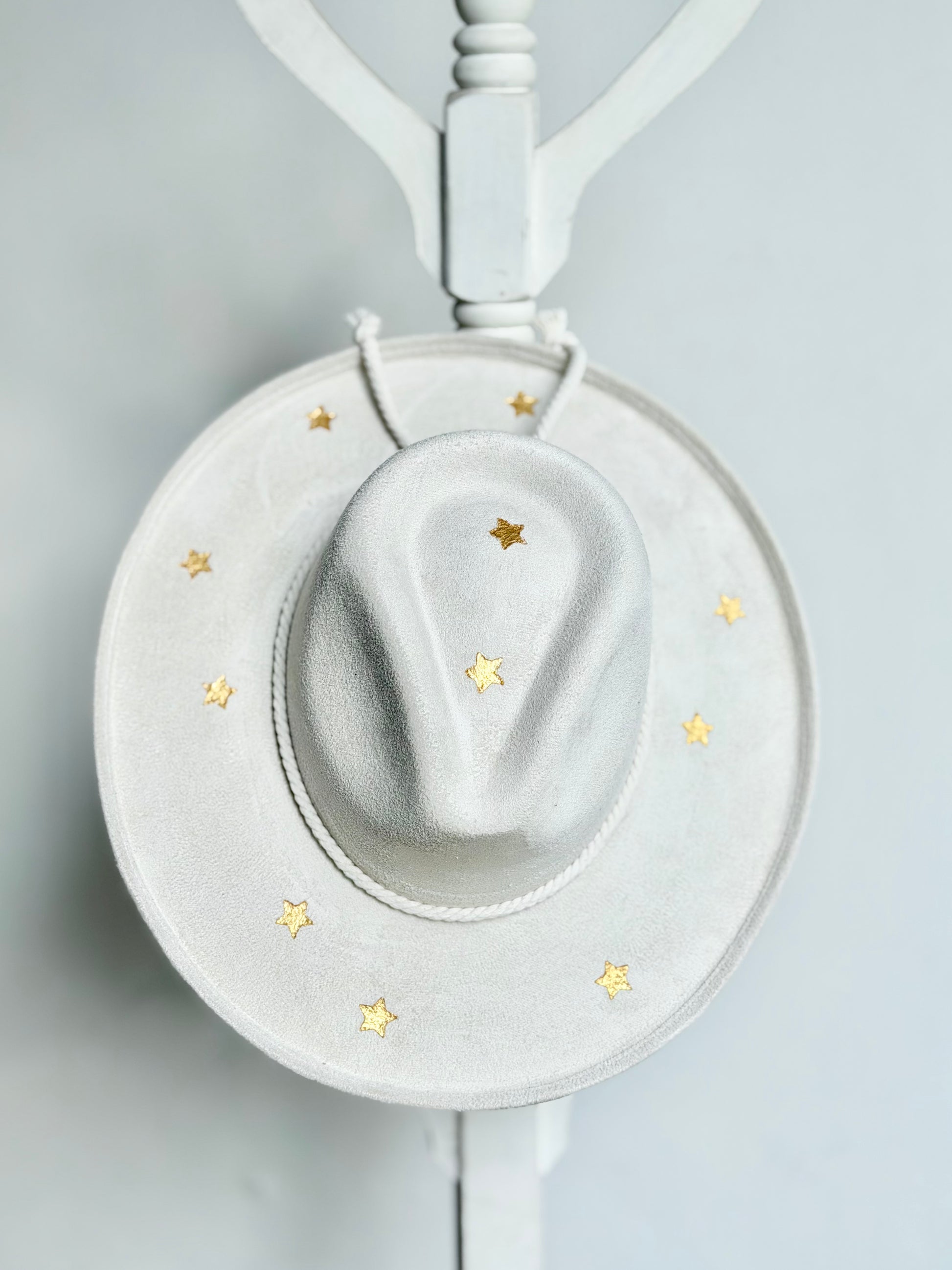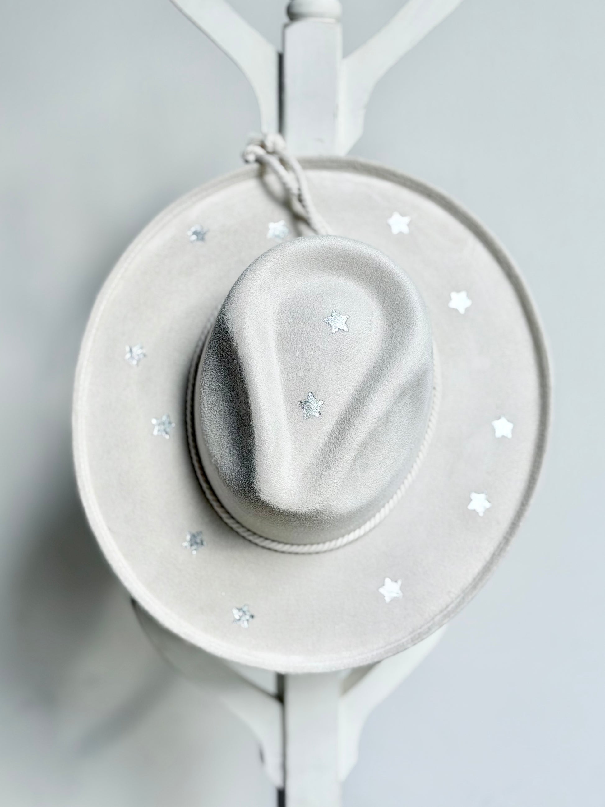 Sombrero de estrellas pequeñas pintadas sobre el ala y un cordón blanco alrededor de la toquilla.
