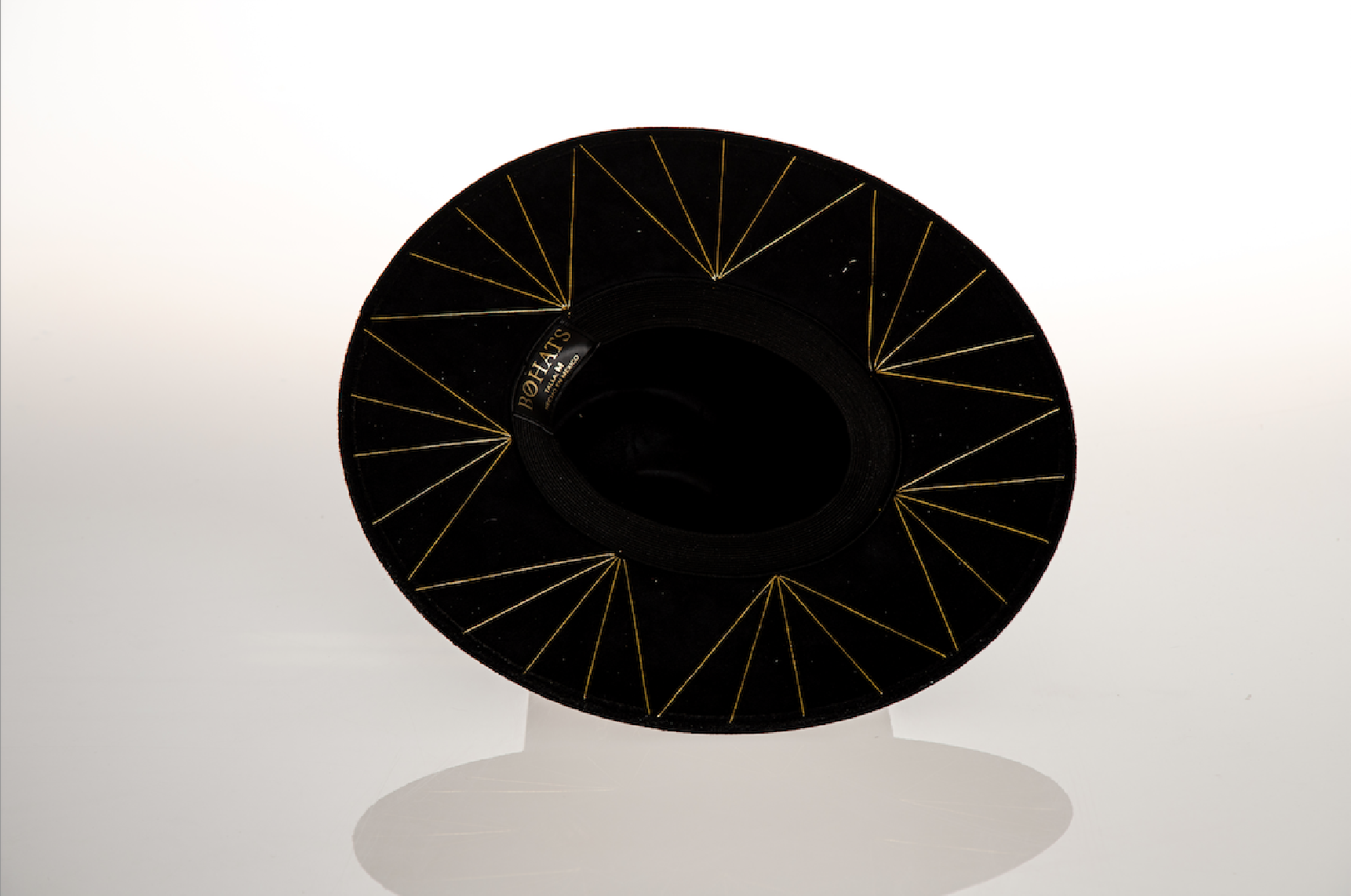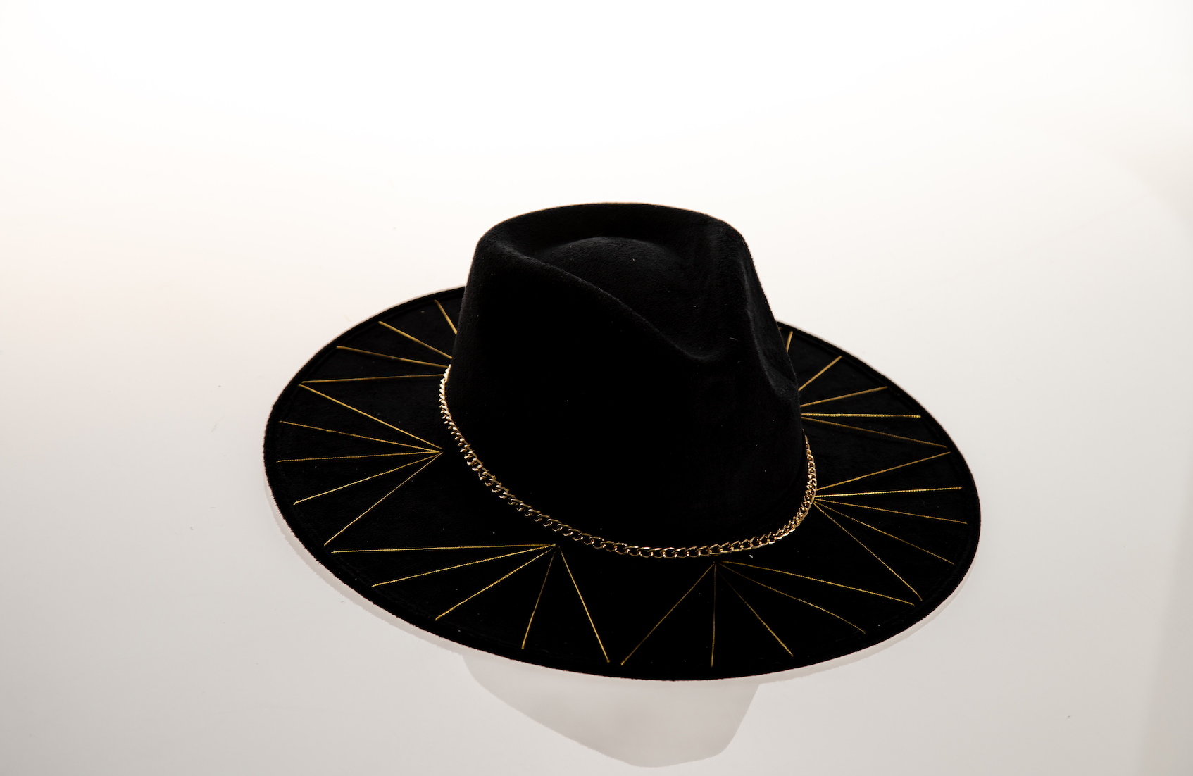 Sombrero bordado a mano con destellos alrededor del ala y cadena delgada en toquilla.