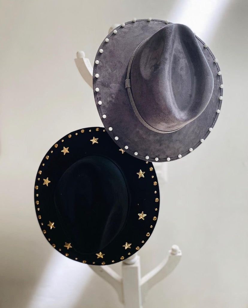 Sombrero con perlas en el alrededor del fila el ala.