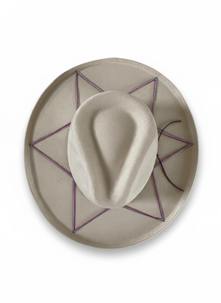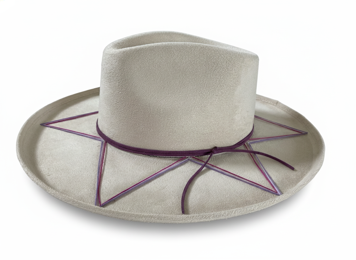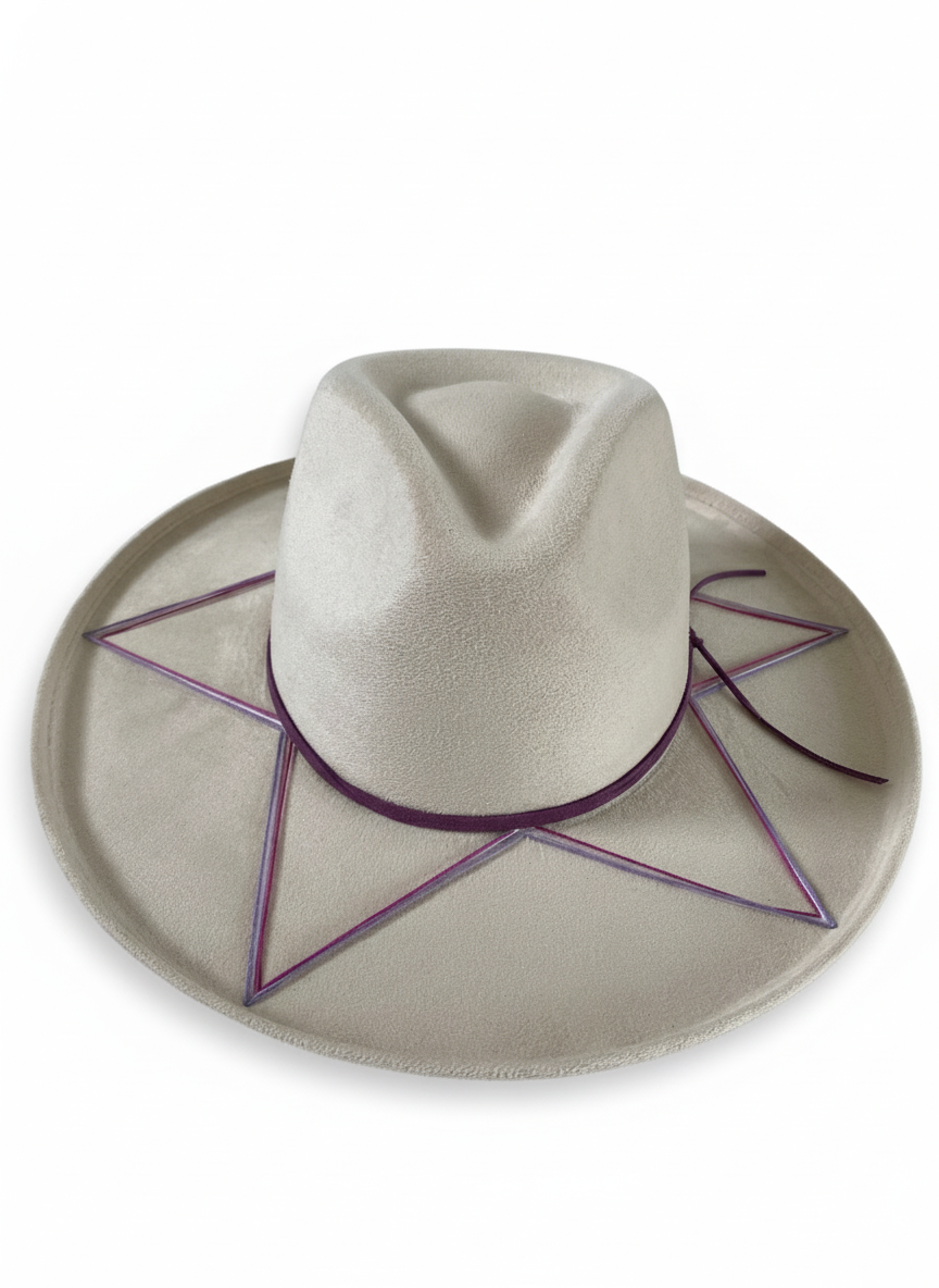 Sombrero dobladillo de gamuza color hueso bordado a mano en tonos violetas/morados